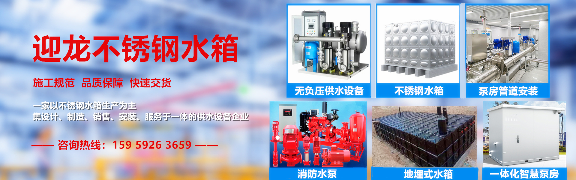 迎龙集团拥有一批二十多年从事各种水箱,成套供水设备,消防工程,水电工程,空气能热水工程,中央空调安装,小 区泵房的节能改造的技术及安装人员。做到技术先进、合理、环保、独特的设计理念,在生产、安装过程中注重设备维护方 便、经济、尽可能合理利用空间。在激励的市场竞争中,稳步发展壮大,得到客户的一致好评。
